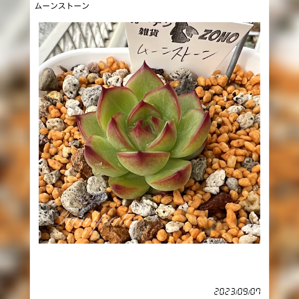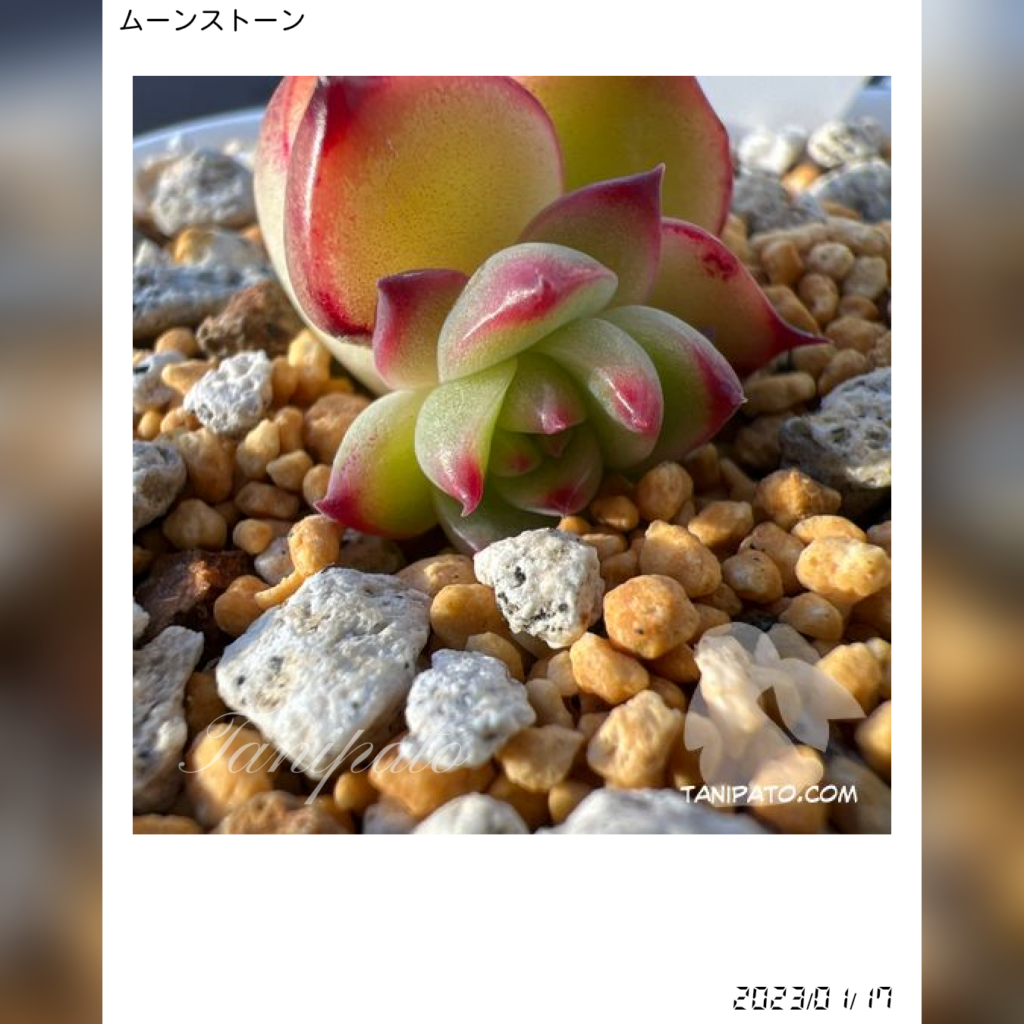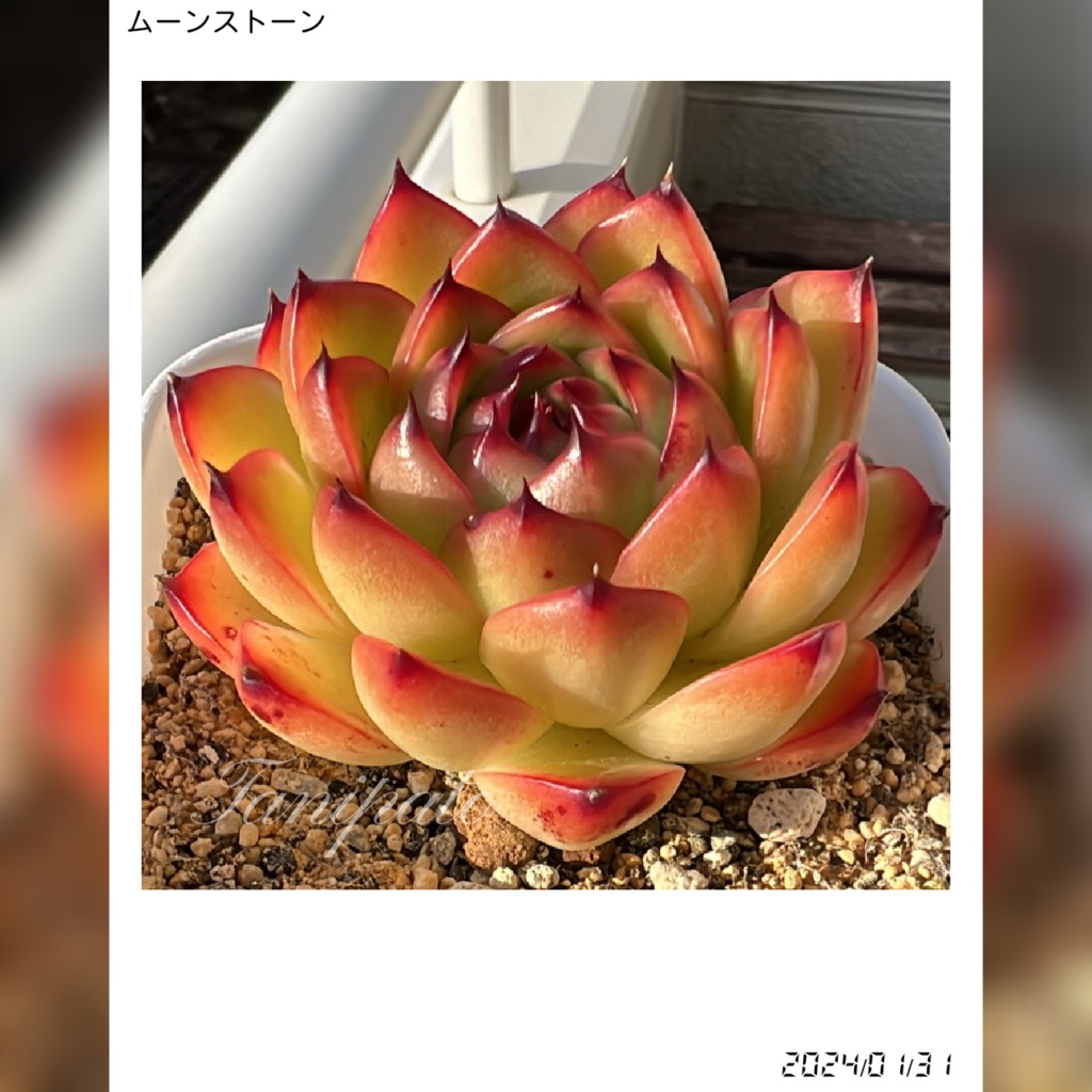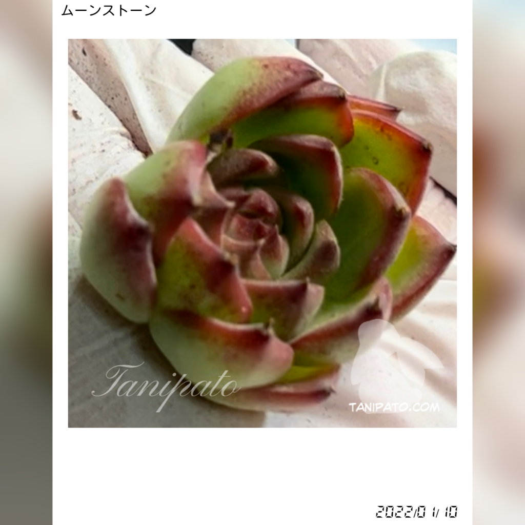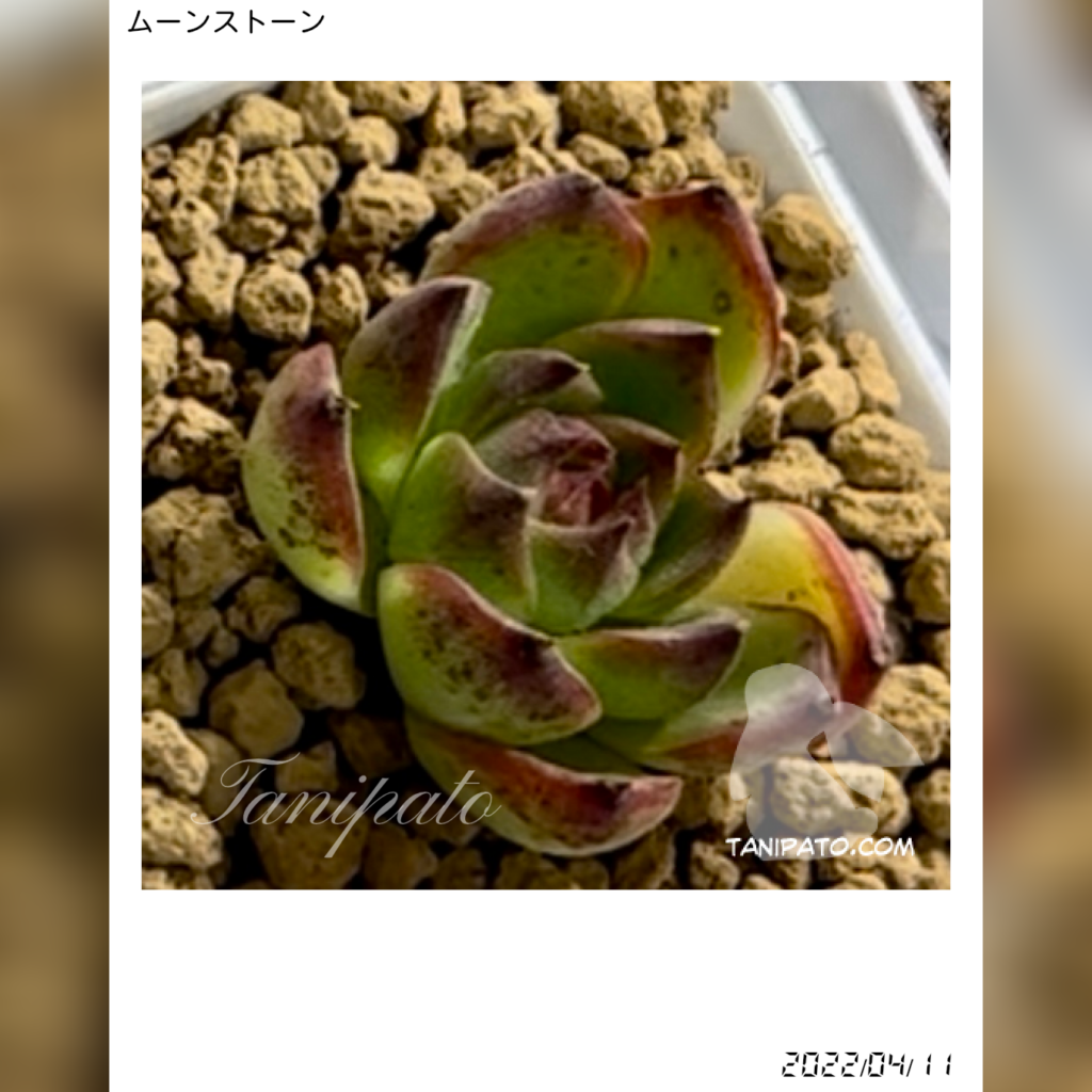 現在のムーンストーンは、ツヤのある緑と鮮やかな赤いエッジが印象的で、健康的なロゼットの形が際立っています。