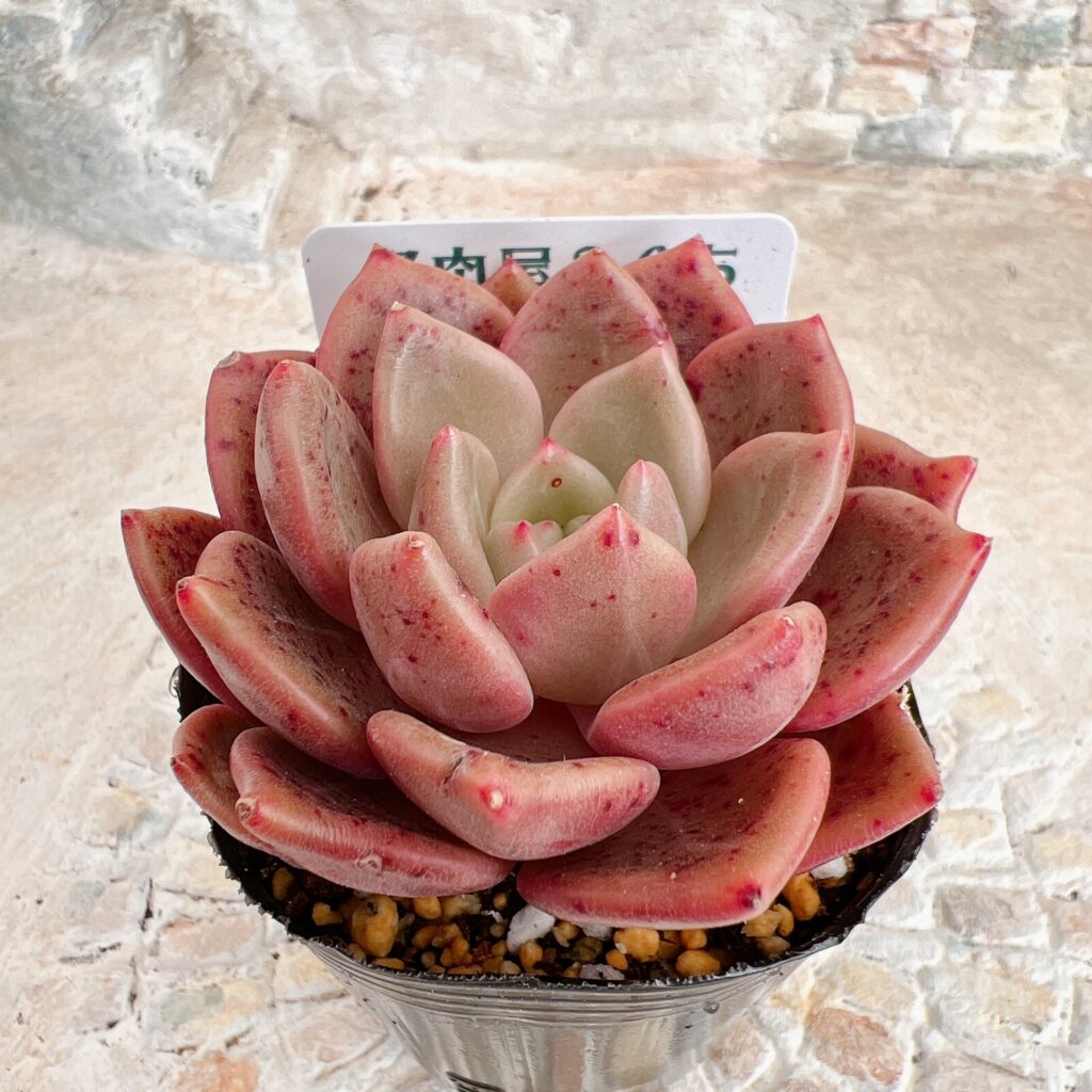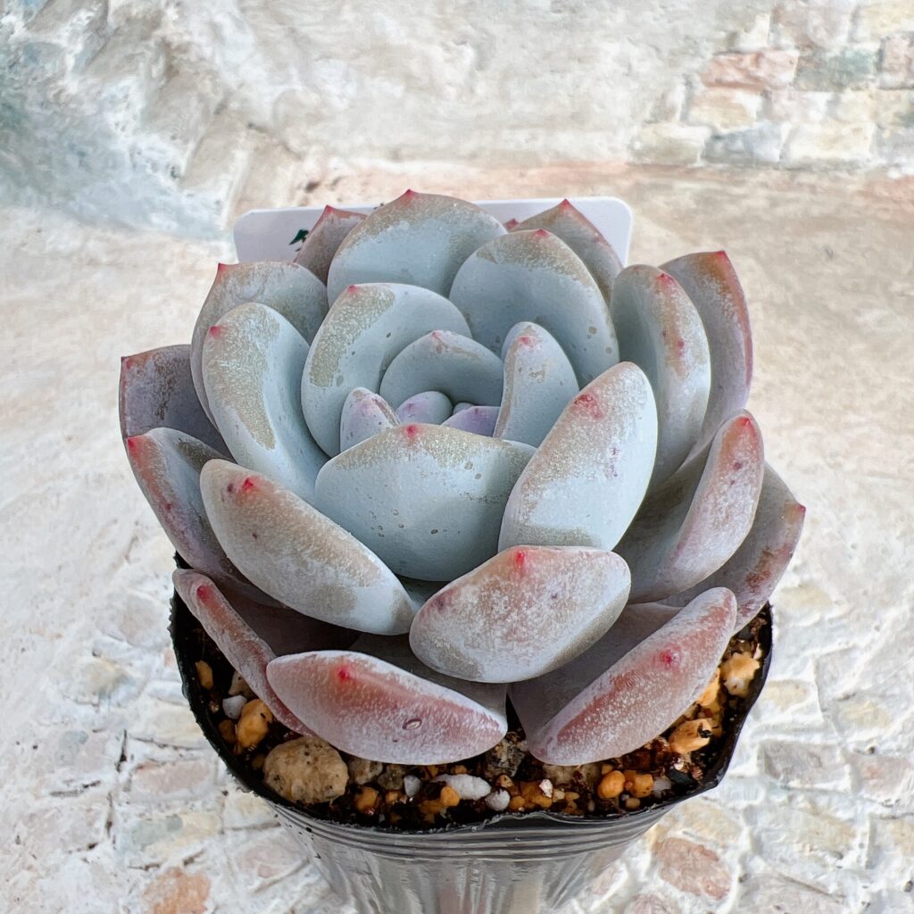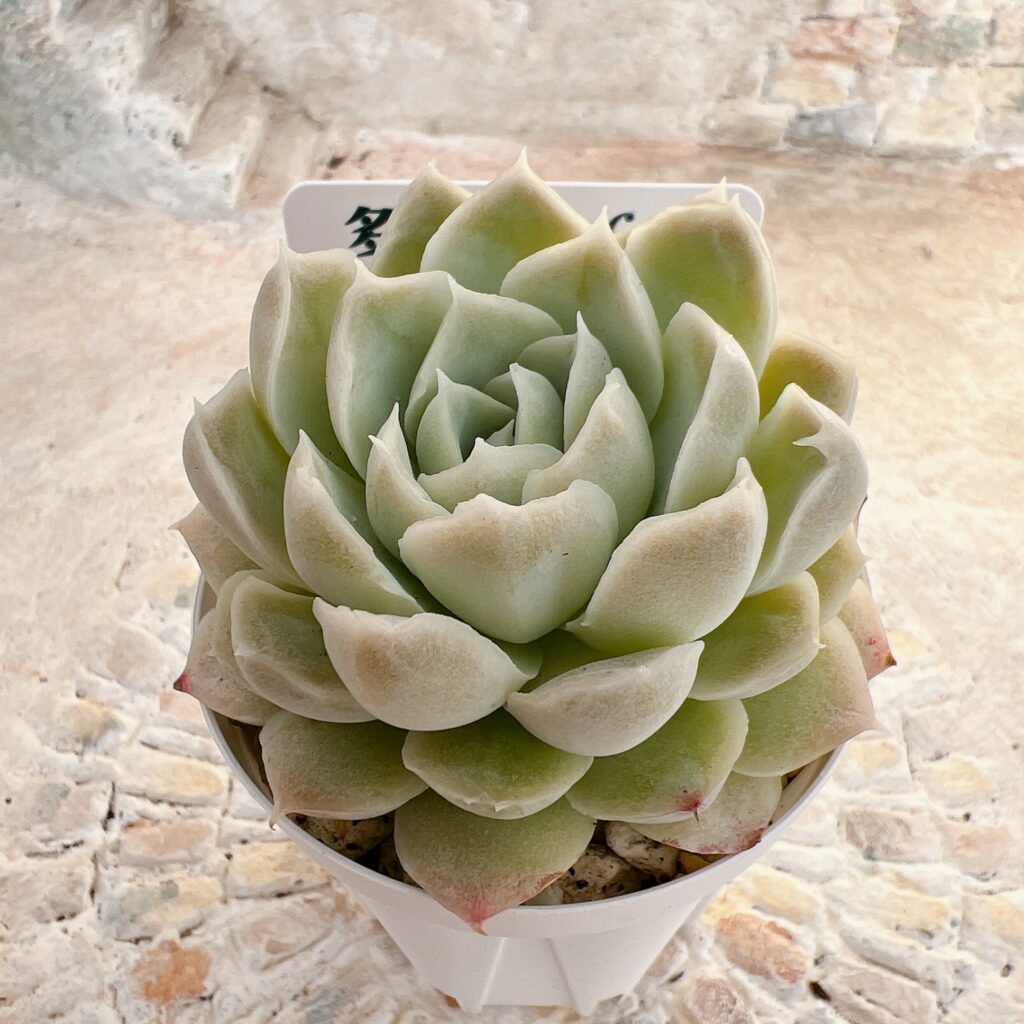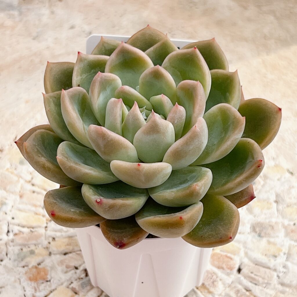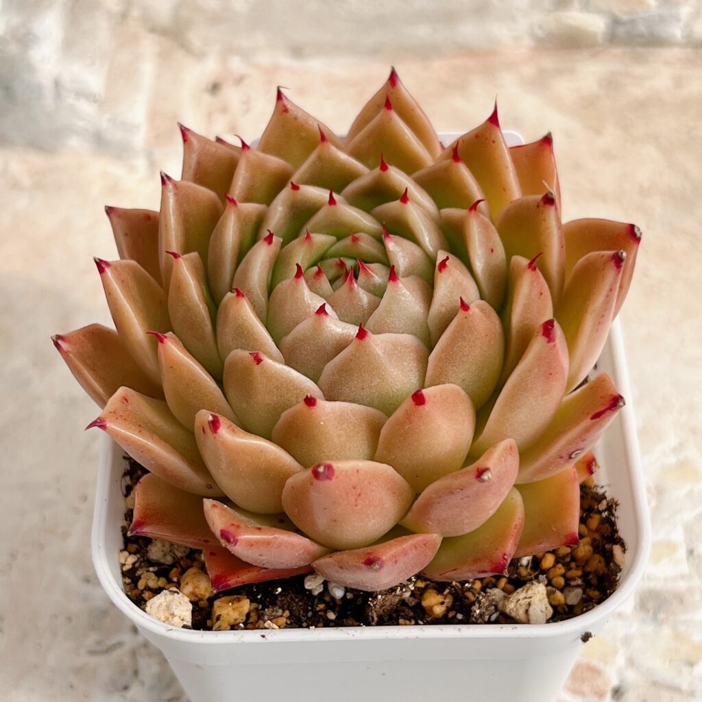 ロゼットの形は整いやすく、葉がきれいに重なり合うため、上から見るとバランスの取れた美しいフォルムを楽しめます。小ぶりながらも存在感があり、単体で飾っても、寄せ植えのアクセントとしても映える品種です。