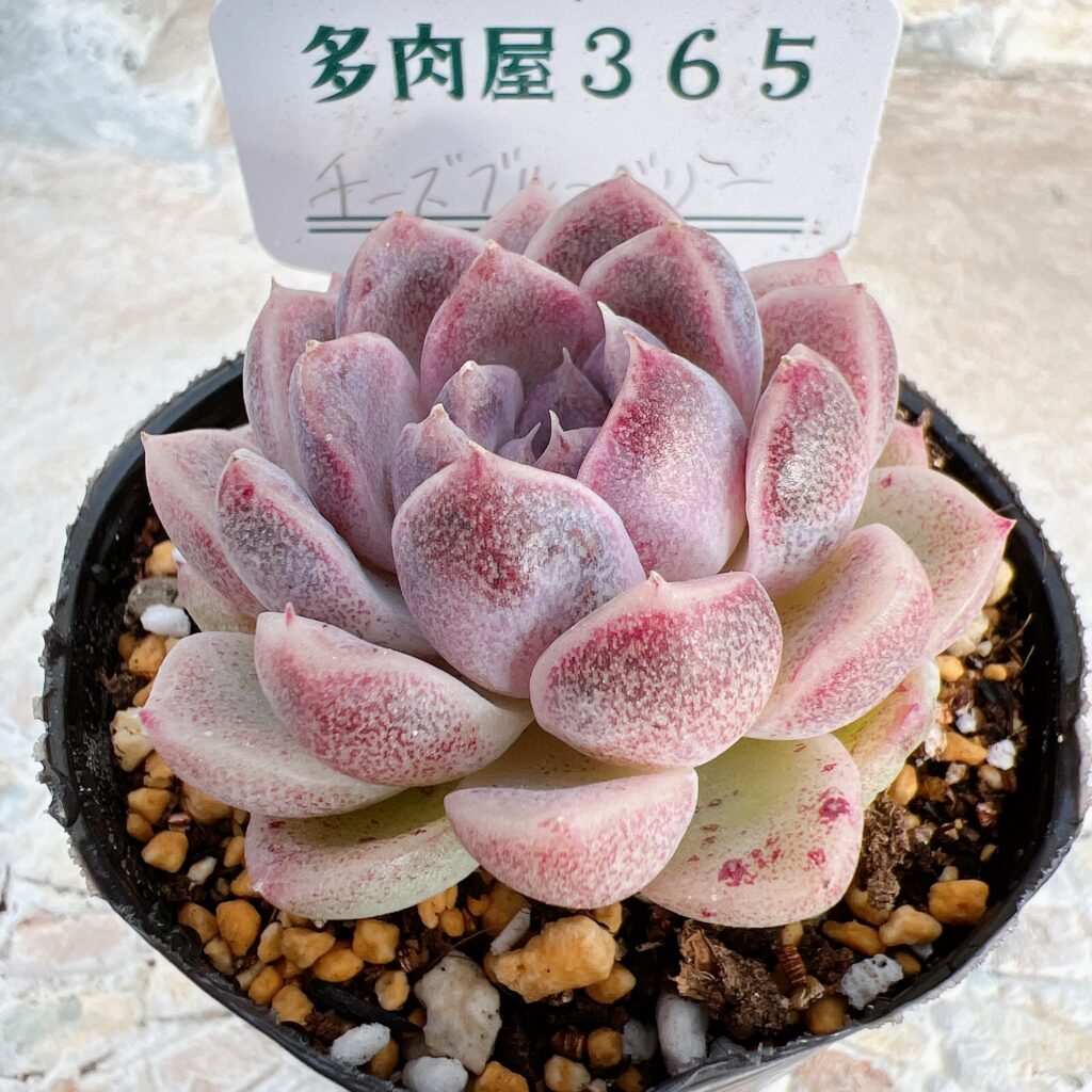 「チーズブルーベリー」は、独特のくすんだ紫がかった葉色が特徴のエケベリア属の多肉植物です。気温が下がると、ブルーベリーのような深みのあるパープルやピンクに染まり、落ち着いた雰囲気の紅葉を楽しめます。